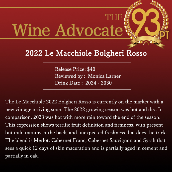 毎年大好評、レ・マッキオーレのボルゲリ・ロッソが待望の高品質ヴィンテージ[2022]年もので限定少量入荷!