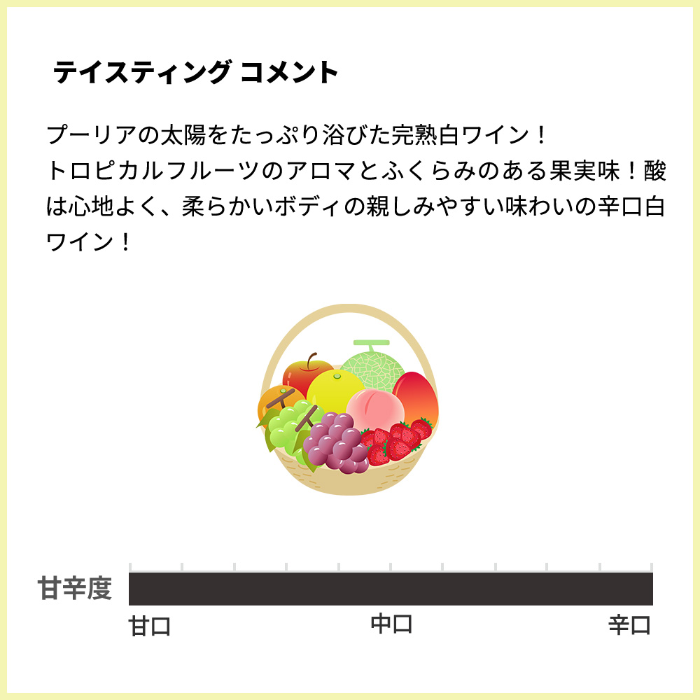 この「ドモード・シャルドネ」は、プーリア州の厳選シャルドネ100%をステンレスタンクで発酵、熟成で造られる極旨辛口白ワイン!プーリアの太陽をたっぷり浴びた完熟白ワイン!トロピカルフルーツのアロマとふくらみのある果実味!酸は心地よく、柔らかいボディの親しみやすい味わいの辛口白ワイン!