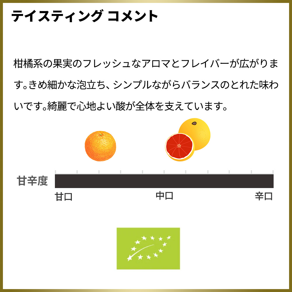 柑橘系の果実のフレッシュなアロマとフレイバーが広がります。きめ細かな泡立ち、シンプルながらバランスのとれた味わいです。綺麗で心地よい酸が全体を支えています。