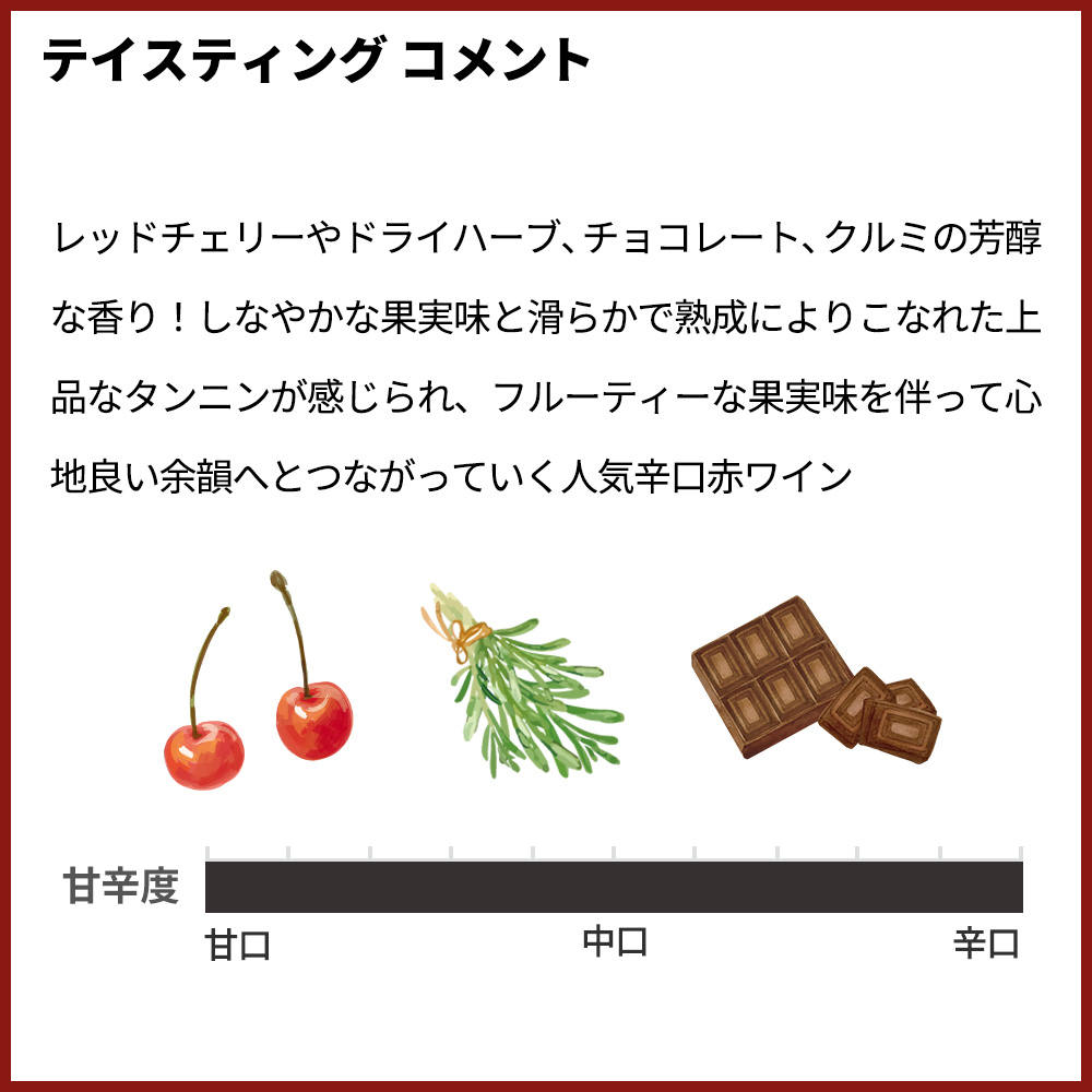 レッドチェリーやドライハーブ、チョコレート、クルミの芳醇な香り!しなやかな果実味と滑らかで熟成によりこなれた上品なタンニンが感じられ、フルーティーな果実味を伴って心地良い余韻へとつながっていく人気辛口赤ワインが正規品で限定入荷!