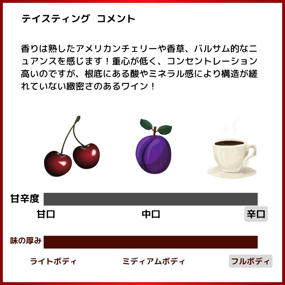 サンジョヴェーゼ由来の質の高い酸に支えられた骨格のしっかりした緻密さのあるワインで非常にバランスが良く、滋味深さを感じることのできるワインです!