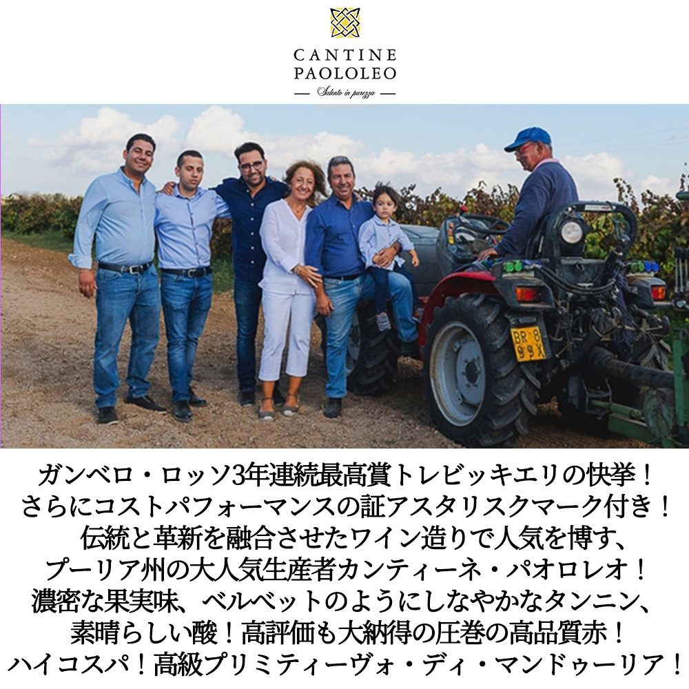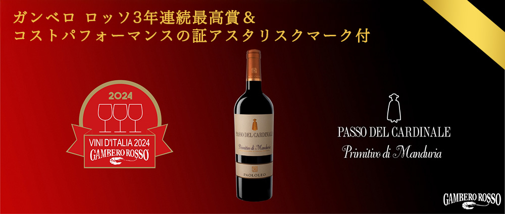 ガンベロ・ロッソ3年連続最高賞トレビッキエリの快挙!今、大注目のハイコスパ・イタリア赤ワイン!パッソ・デル・カルディナーレ・プリミティーヴォ・ディ・マンドゥーリアが限定で少量入荷!
