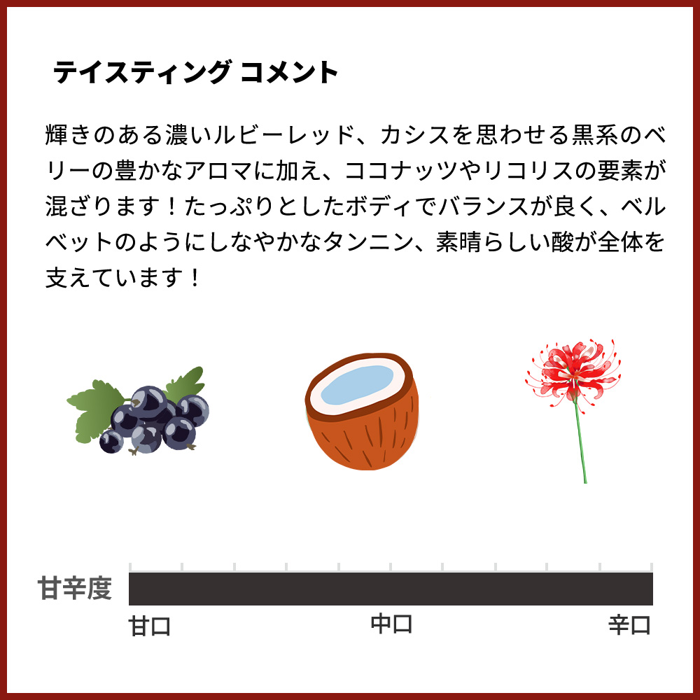 輝きのある濃いルビーレッド、カシスを思わせる黒系のベリーの豊かなアロマに加え、ココナッツやリコリスの要素が混ざります!たっぷりとしたボディでバランスが良く、ベルべットのようにしなやかなタンニン、素晴らしい酸が全体を支えています!余韻にはスパイスを入れたジャムや野生のフルーツのニュアンスが漂います!