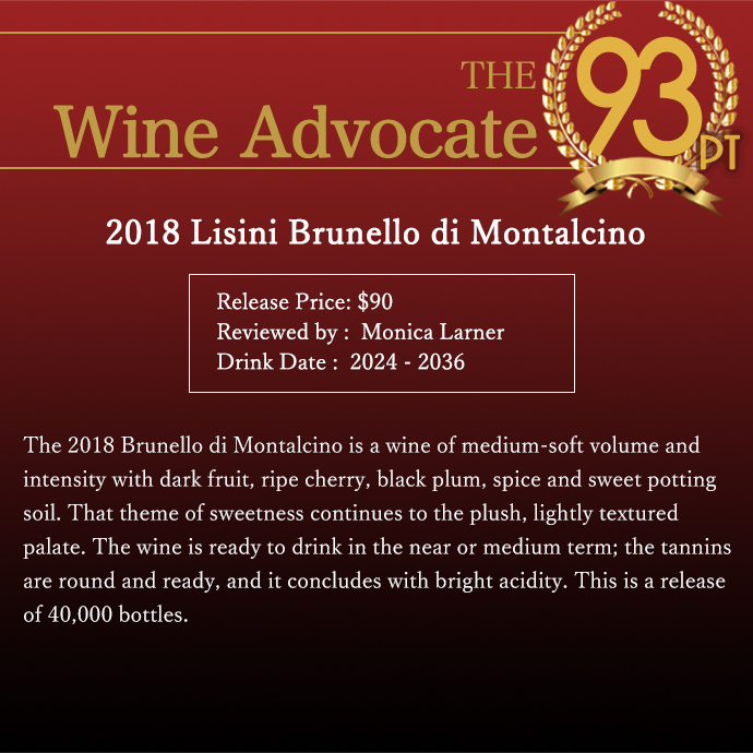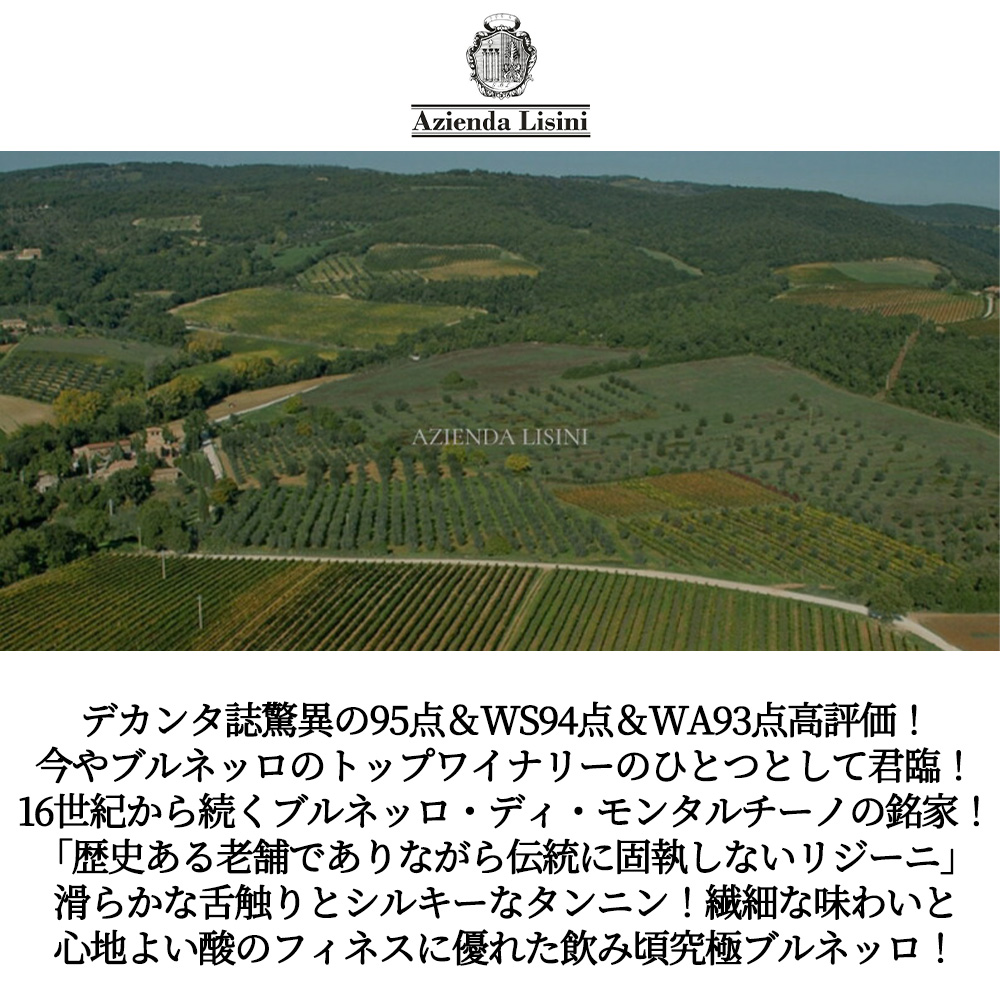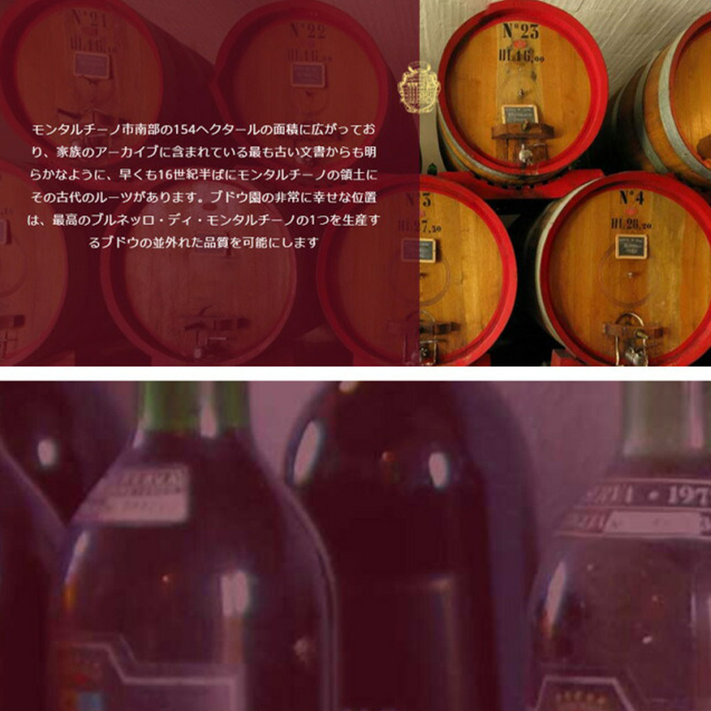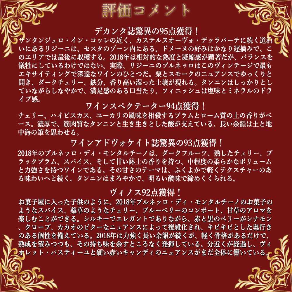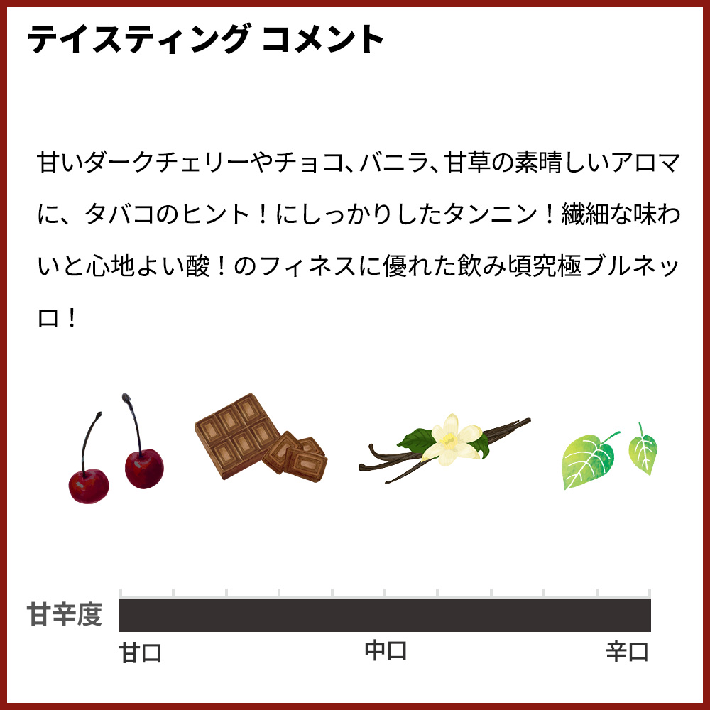 甘いダークチェリーやチョコ、バニラ、甘草の素晴しいアロマに、タバコのヒント!にしっかりしたタンニン!繊細な味わいと心地よい酸!のフィネスに優れた飲み頃究極ブルネッロ!