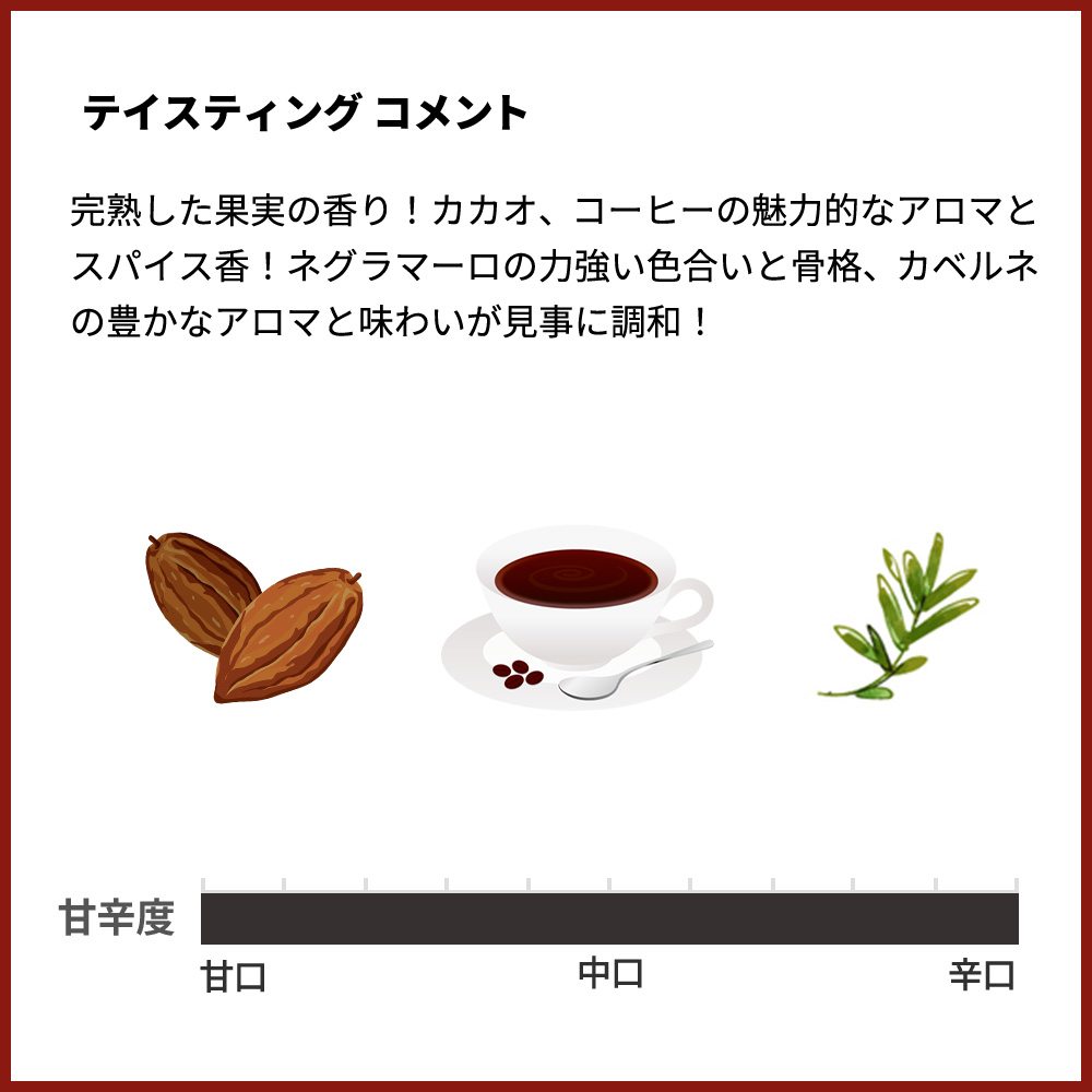 完熟した果実の香り!カカオ、コーヒーの魅力的なアロマとスパイス香!ネグラマーロの力強い色合いと骨格、カベルネの豊かなアロマと味わいが見事に調和!滑らかな舌触りの究極フルボディ辛口赤ワインが高評価で飲み頃[2020]年で限定少量入荷!