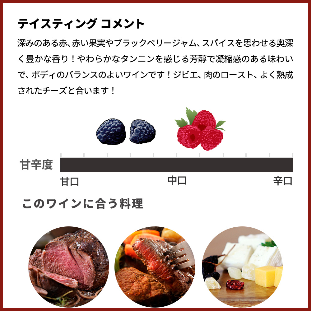 丁寧に手摘みで収穫したブドウの水分をゆっくりと時間をかけてとばして造られます!深みのある赤、赤い果実やブラックベリージャム、スパイスを思わせる奥深く豊かな香り!やわらかなタンニンを感じる芳醇で凝縮感のある味わいで、ボディのバランスのよいワインです!
