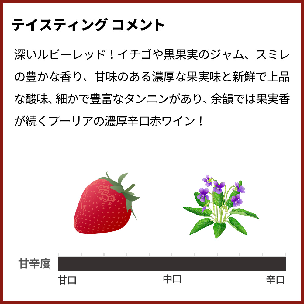 深いルビーレッド!イチゴや黒果実のジャム、スミレの豊かな香り、甘味のある濃厚な果実味と新鮮で上品な酸味、細かで豊富なタンニンがあり、余韻では果実香が続くプーリアの濃厚辛口赤ワイン!最強コスパ赤ワインが限定で少量入荷!