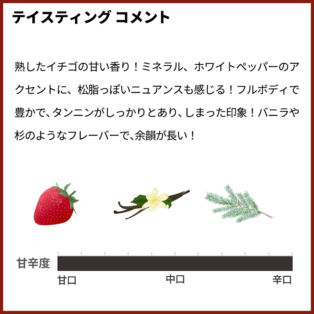 熟したイチゴの甘い香り!ミネラル、ホワイトペッパーのアクセントに、松脂っぽいニュアンスも感じる!フルボディで豊かで、タンニンがしっかりとあり、しまった印象!バニラや杉のようなフレーバーで、余韻が長い!
