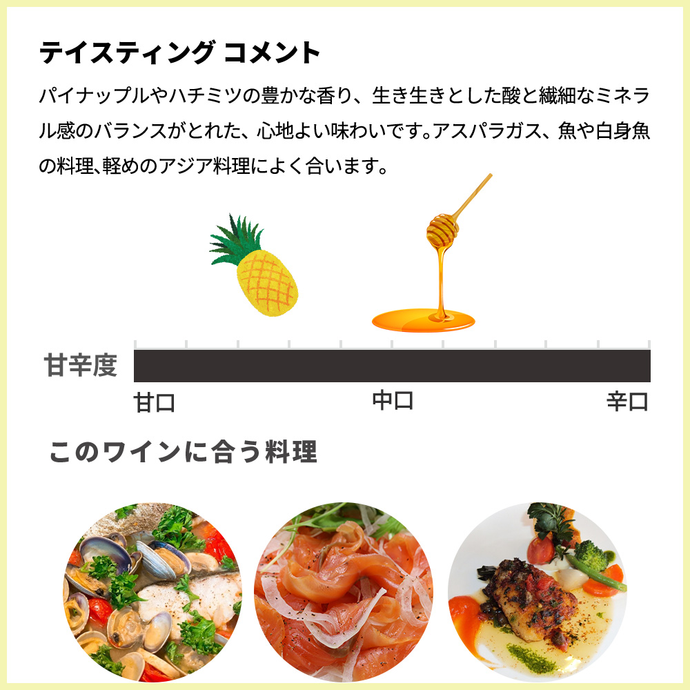 パイナップルやハチミツの豊かな香り、生き生きとした酸と繊細なミネラル感のバランスがとれた、心地よい味わいです。