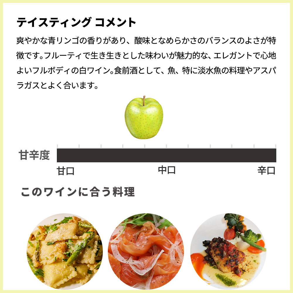 爽やかな青リンゴの香りがあり、酸味となめらかさのバランスのよさがこのシャルドネワインの特徴です。フルーティで生き生きとした味わいが魅力的な、エレガントで心地よいフルボディの白ワインです。
