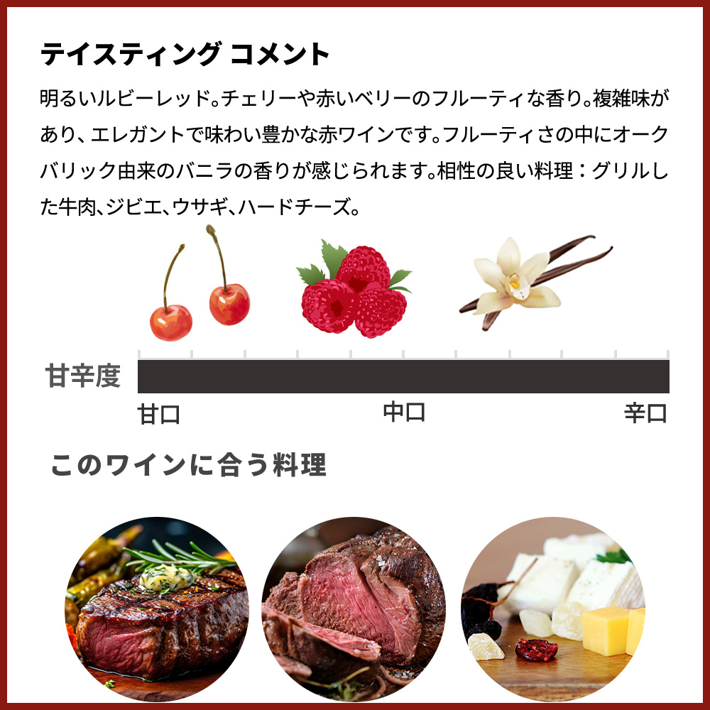 明るいルビーレッド。チェリーや赤いベリーのフルーティな香り。複雑味があり、エレガントで味わい豊かな赤ワインです。フルーティさの中にオークバリック由来のバニラの香りが感じられます。メディテーションワインとして楽しむこともできる赤ワインです。