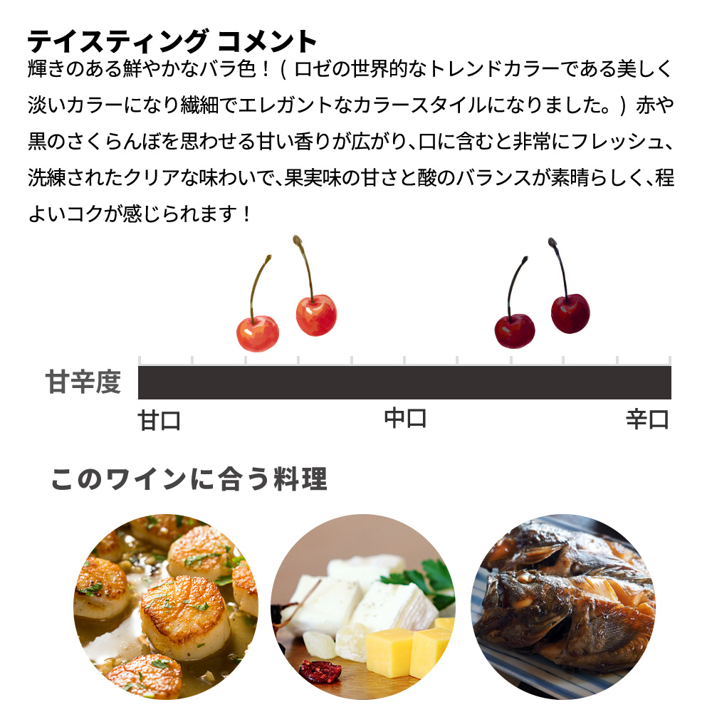 この調和の取れたロゼワインは、10~12°C の飲用温度で、その香りを最大限に発揮します。バーベキュー、サラダ、カルパッチョなどと一緒にどうぞ。