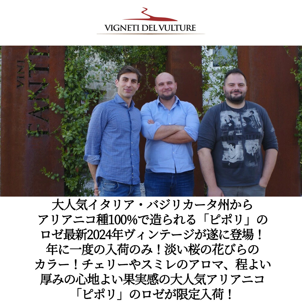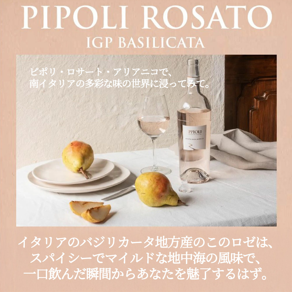 ピポリ・ロサート・アリアニコは、バジリカータのヴィニェティ・デル・ヴルトゥーレワイナリーが生産する、淡いピンク色のロゼワイン。このワインは、アリアニコという単一品種のみを使用して造られています。グラスに注ぐと、鮮やかなチェリーピンク色のドライワインが目を引きます。香りは、野イチゴやラズベリーの香りを主体とし、チェリーやザクロのほのかな香りと調和した、フルーティーなブーケが特徴です。ピポリ・ロサートは、口当たりがバランスが良く、ジューシーで、酸味のバランスも絶妙です。後味は驚くほど長く、濃厚です。