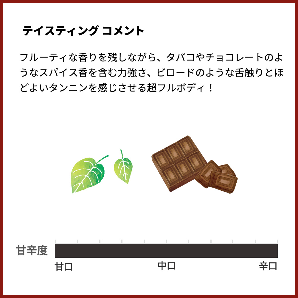 フルーティな香りを残しながら、タバコやチョコレートのようなスパイス香を含む力強さ、ビロードのような舌触りとほどよいタンニンを感じさせる超フルボディ!