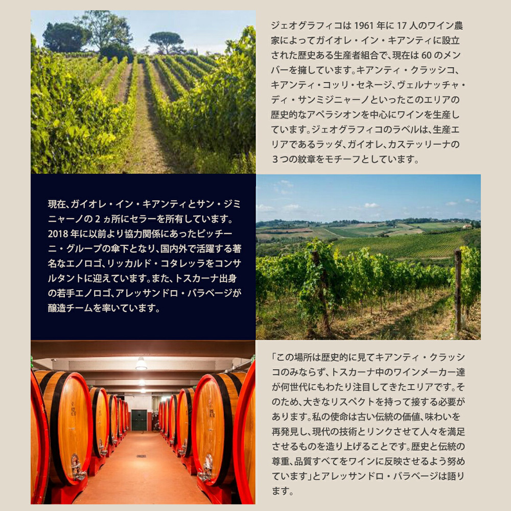 -醸造家が語る2024VTについて-「ジェオグラフィコにとって、2024VTはこの10年間で最も良いヴィンテージになりました。実験的に、ヴェルメンティーノとサンジョヴェーゼから、ブラン ド ノワールを造ってみたほどです。特に白ワインとロゼワインが素晴らしく、非常に良いアロマを得ることができました。収穫量も十分にあります。赤ワイン用の葡萄は、収量は平均より少なくなりましたが、醸し発酵の期間を短くすることで果実味を抽出し過ぎないようにしました。白とロゼ用葡萄は8月末-9月初旬、赤用葡萄は9月初旬から収穫しました」――
