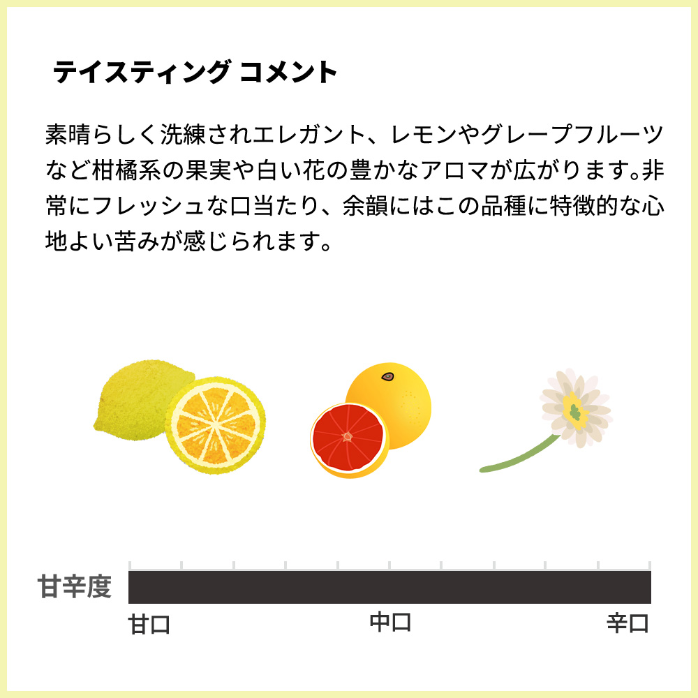 素晴らしく洗練されエレガント、レモンやグレープフルーツなど柑橘系の果実や白い花の豊かなアロマが広がります。非常にフレッシュな口当たり、余韻にはこの品種に特徴的な心地よい苦みが感じられます。