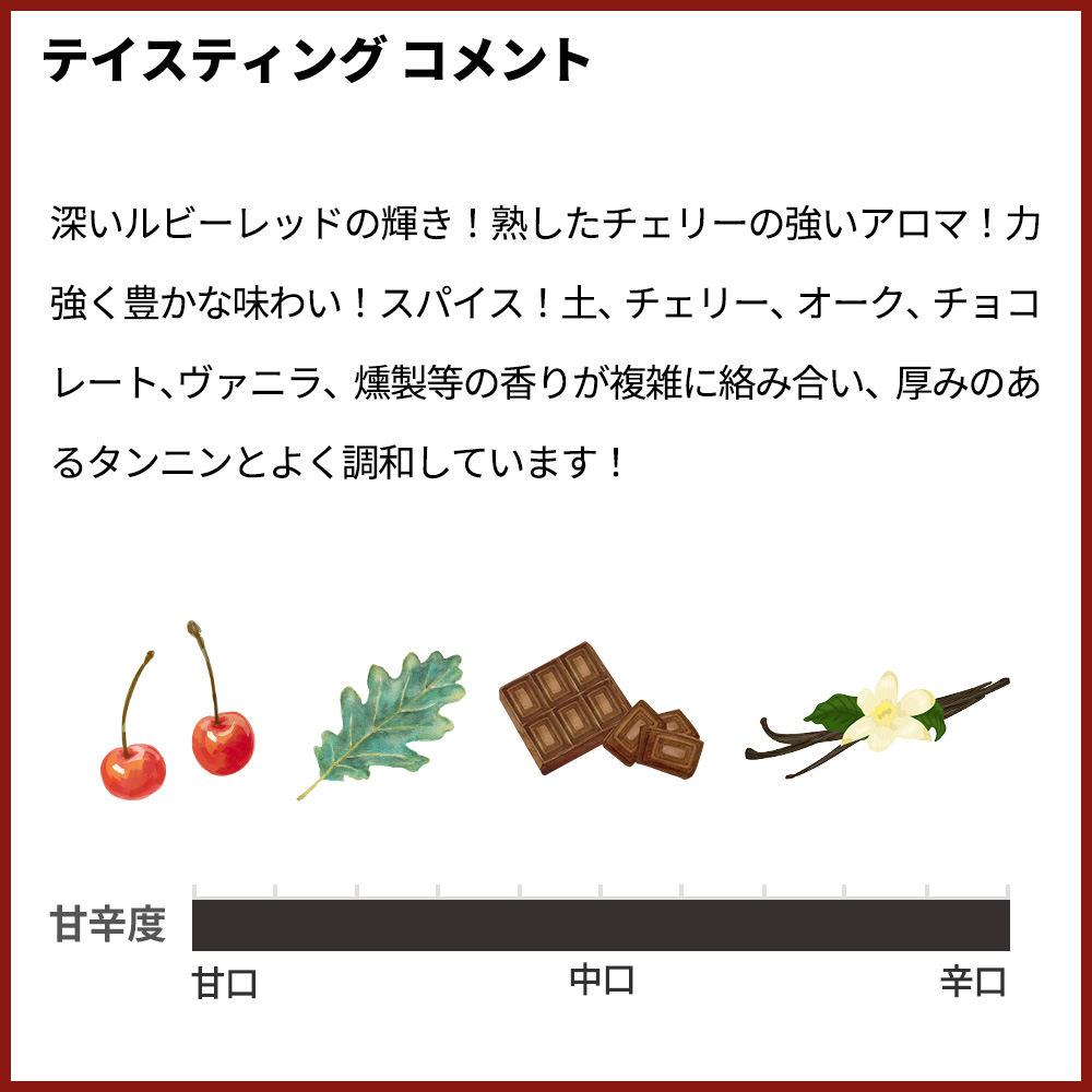 深いルビーレッドの輝き!熟したチェリーの強いアロマ!力強く豊かな味わい!スパイス!土、チェリー、オーク、チョコレート、ヴァニラ、燻製等の香りが複雑に絡み合い、厚みのあるタンニンとよく調和しています!