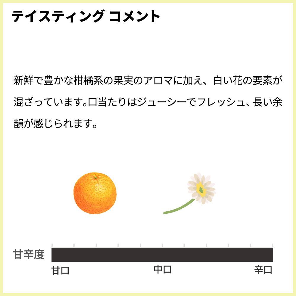 新鮮で豊かな柑橘系の果実のアロマに加え、白い花の要素が混ざっています。口当たりはジューシーでフレッシュ、長い余韻が感じられます。もちろん正規品の素晴らしい状態で限定入荷!