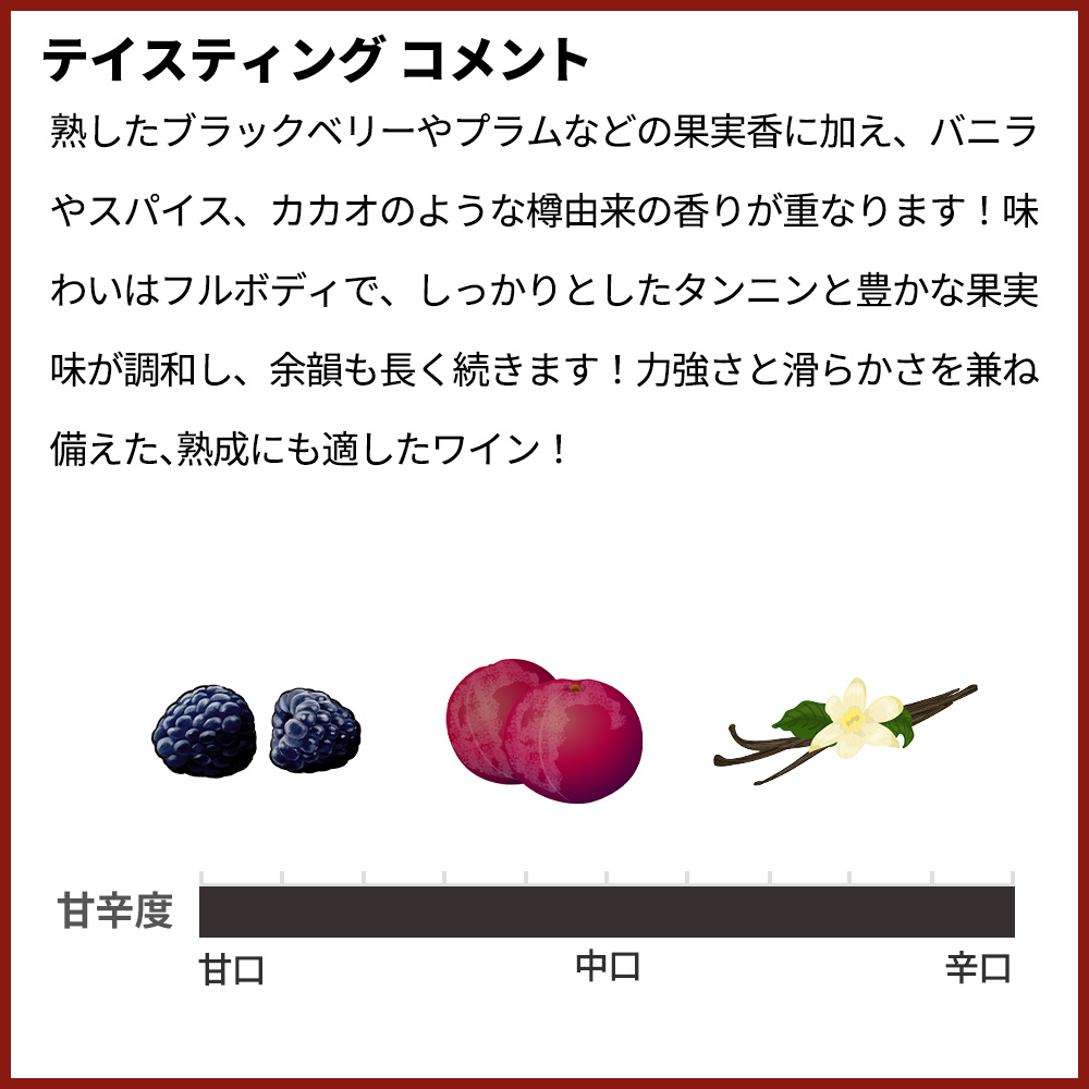 濃厚かつ上品な味わいが特徴!熟したブラックベリーやプラムなどの果実香に加え、バニラやスパイス、カカオのような樽由来の香りが重なります!味わいはフルボディで、しっかりとしたタンニンと豊かな果実味が調和し、余韻も長く続きます!力強さと滑らかさを兼ね備えた、熟成にも適したワイン!