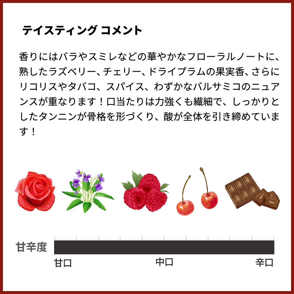 深みのあるガーネット色を帯び、香りにはバラやスミレなどの華やかなフローラルノートに、熟したラズベリー、チェリー、ドライプラムの果実香、さらにリコリスやタバコ、スパイス、わずかなバルサミコのニュアンスが重なります!口当たりは力強くも繊細で、しっかりとしたタンニンが骨格を形づくり、酸が全体を引き締めています!樽熟成によるバニラやチョコレートの風味が滑らかに溶け込み、長い余韻を残すエレガントな逸品!