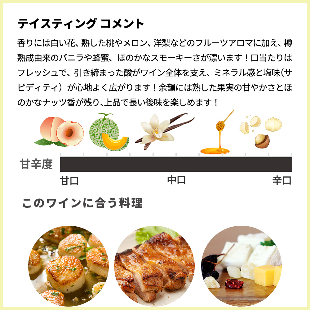 外観は明るい麦わら色!香りには白い花、熟した桃やメロン、洋梨などのフルーツアロマに加え、樽熟成由来のバニラや蜂蜜、ほのかなスモーキーさが漂います!口当たりはフレッシュで、引き締まった酸がワイン全体を支え、ミネラル感と塩味(サピディティ)が心地よく広がります!ステンレス熟成による清涼感と、木樽発酵による丸み・厚みが調和し、バランスの良い構成を見せます!余韻には熟した果実の甘やかさとほのかなナッツ香が残り、上品で長い後味を楽しめます!