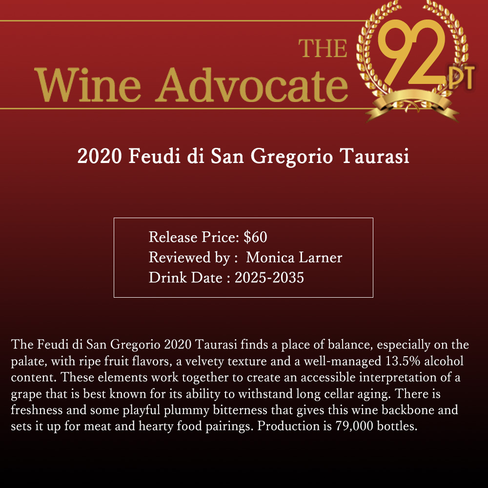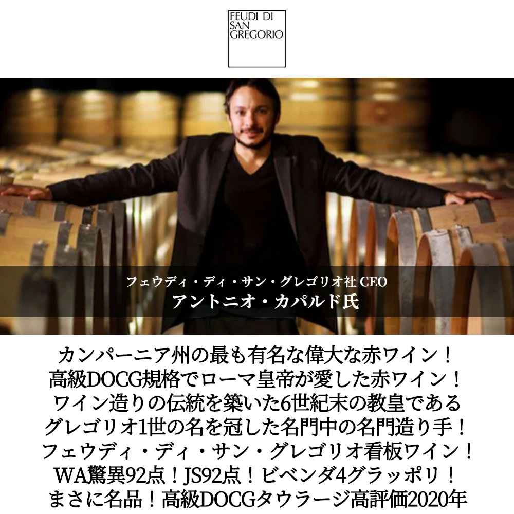 造り手は、幸多き大地カンパーニャ州から、土壌と地元のブドウ品種にこだわり、今やイタリアワインの新潮流!にまで向上させた銘醸!ワイン造りの伝統を築いた6世紀末の教皇グレゴリオ1世の名を冠した造り手!フェウディ・ディ・サン・グレゴリオの看板ワイン!高級DOCGタウラージ!