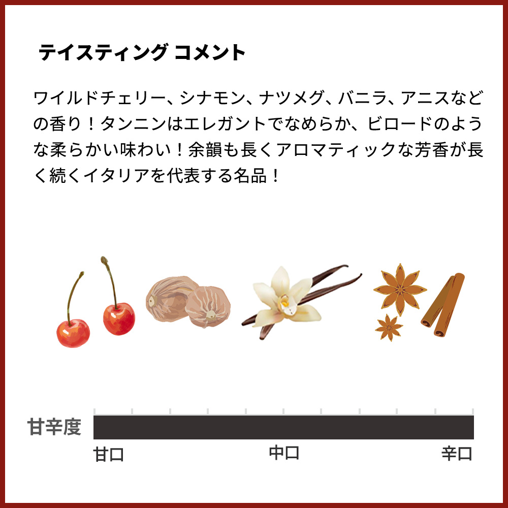 ワイルドチェリー、シナモン、ナツメグ、バニラ、アニスなどの香り!タンニンはエレガントでなめらか、ビロードのような柔らかい味わい!余韻も長くアロマティックな芳香が長く続くイタリアを代表する名品!