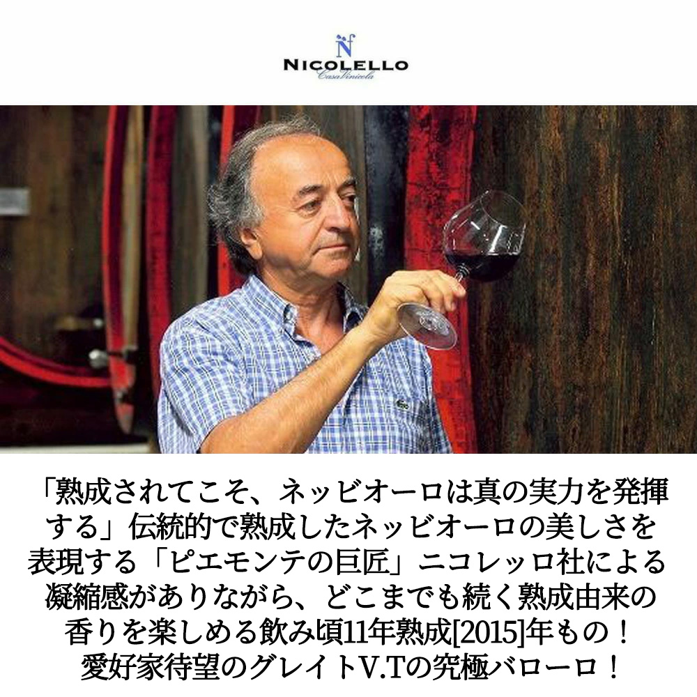 造り手は、1900年初頭、ワイン造りの伝統が根付いたピエモンテ州のランゲとロエロの丘陵にワイナリーを設立した非常に長い歴史を誇る生産者!「熟成されてこそ、ネッビオーロは真の実力を発揮する」という信念のもと、飲み頃になるまで出荷はされず、また飲み頃を過ぎたものは販売しないという歴史あるワイナリー!ニコレッロ社から、オーク樽48ヶ月以上 (スロヴァニアンオーク5500L) 、瓶熟成18ヶ月の長期熟成のあと、リリースされた熟成バローロ!