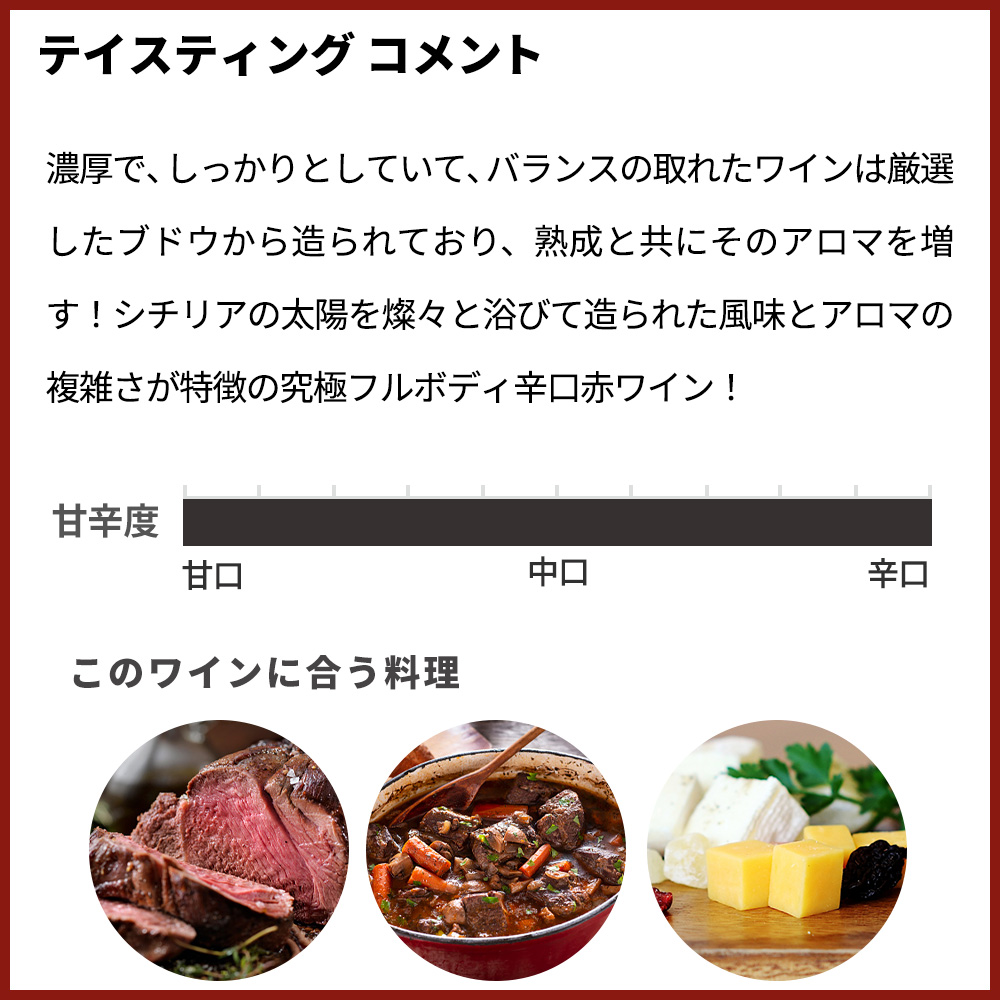 濃厚で、しっかりとしていて、バランスの取れたワインは厳選したブドウから造られており、熟成と共にそのアロマを増す!シチリアの太陽を燦々と浴びて造られた風味とアロマの複雑さが特徴の究極フルボディ辛口赤ワイン!ジビエや煮込んだ赤身の肉料理に、熟成したチーズなど幅広い料理と相性抜群!