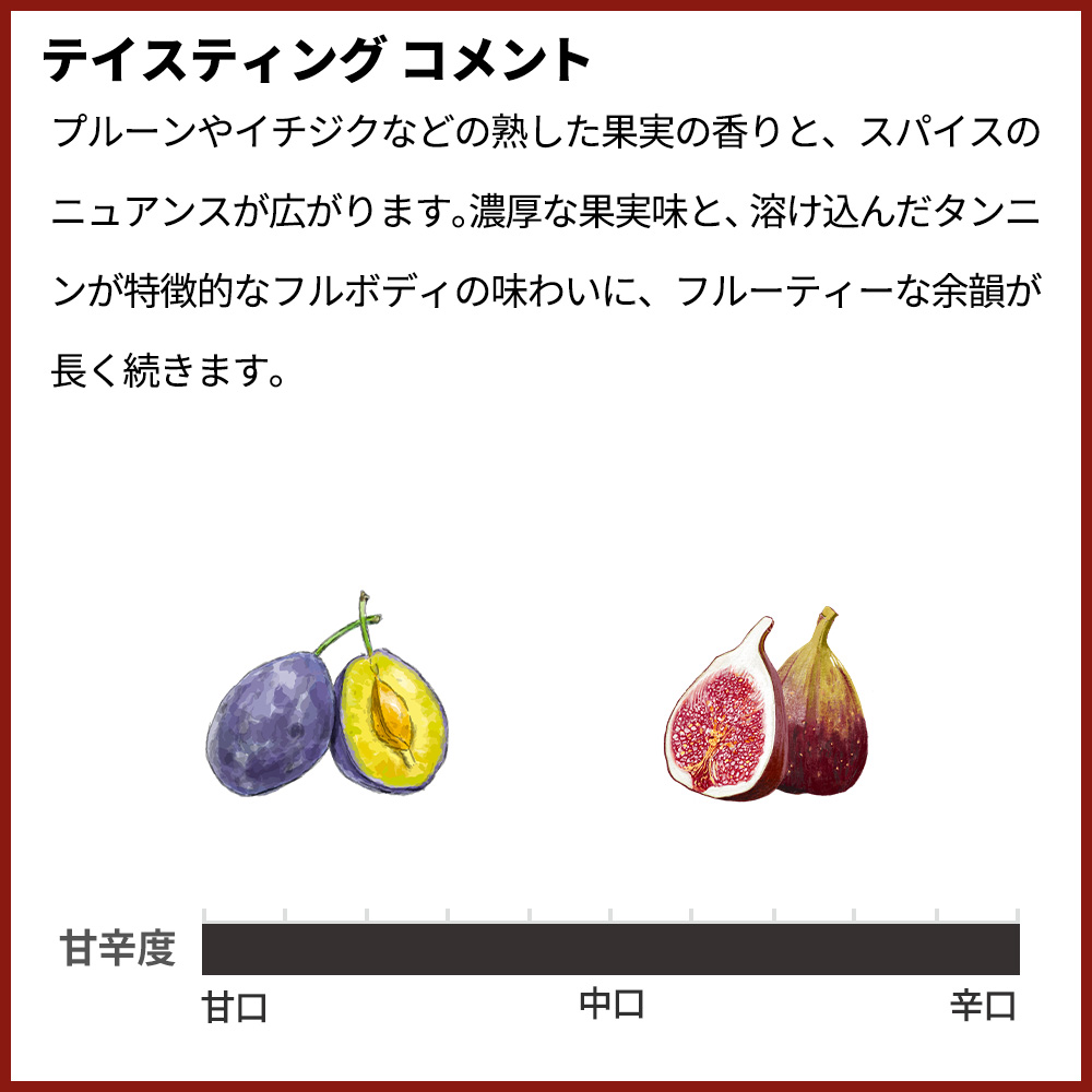 濃厚なレッドカラーの外観に、プルーンやイチジクなどの熟した果実の香りと、スパイスのニュアンスが広がります。濃厚な果実味と、溶け込んだタンニンが特徴的なフルボディの味わいに、フルーティーな余韻が長く続きます。肉料理全般やハードチーズなどと良く合います。