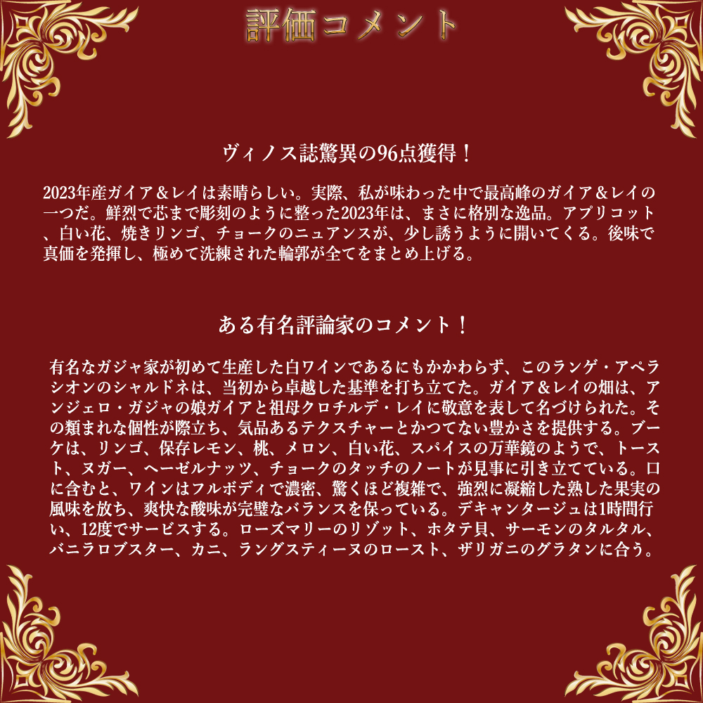 今からでも十分お楽しみいただけますが、10年程度の長期熟成のポテンシャルも備えた、熟成による変化も楽しめる白ワイン!ガヤ・エ・レイ・シャルドネ高評価[2023]年が正規品で限定で少量入荷!