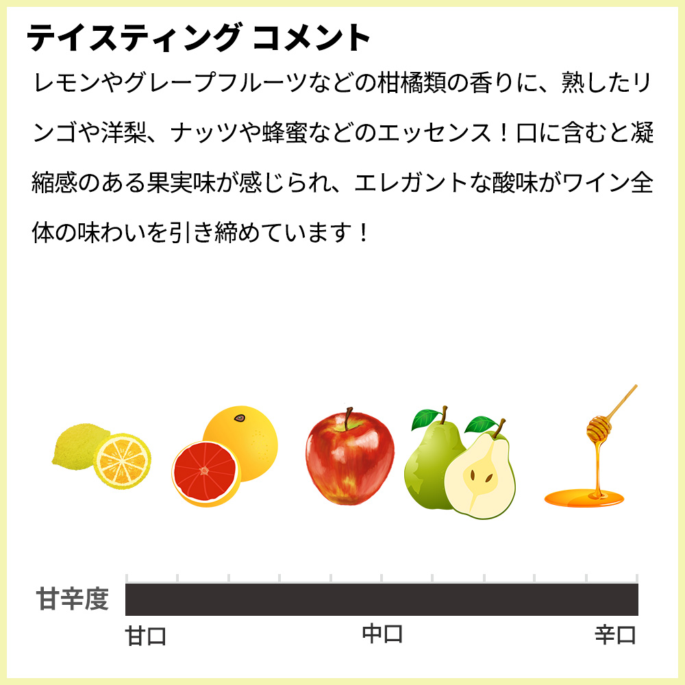 レモンやグレープフルーツなどの柑橘類の香りに、熟したリンゴや洋梨、ナッツや蜂蜜などのエッセンス!口に含むと凝縮感のある果実味が感じられ、エレガントな酸味がワイン全体の味わいを引き締めています!非常に力強く調和のとれたスタイルで、シャープなミネラル感を纏った長い余韻は飲んだ人に感動を与えるほど!熟成させることによって更に優美なスタイルへと変貌する、素晴らしい白ワイン!