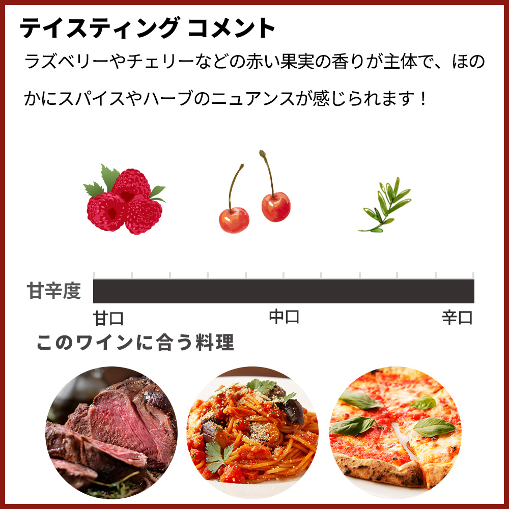 ラズベリーやチェリーなどの赤い果実の香りが主体で、ほのかにスパイスやハーブのニュアンスが感じられます!口当たりはなめらかで、サンジョヴェーゼらしい程よい酸味が全体を引き締め、タンニンは穏やか!果実味と酸のバランスが良く、後味はすっきりしています!重すぎず飲み疲れしないため、食事と合わせやすく、グリル肉やパスタ、ピッツァ、特にトマト系料理との相性が抜群!
