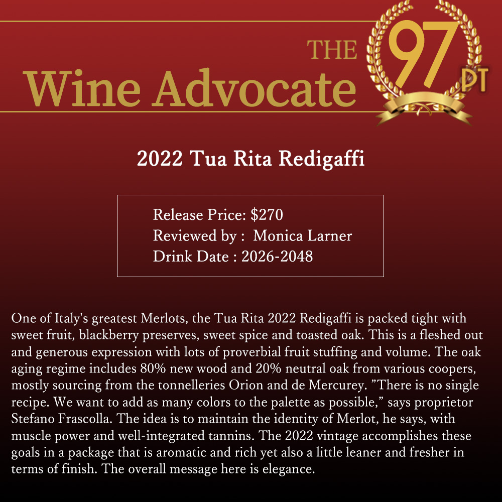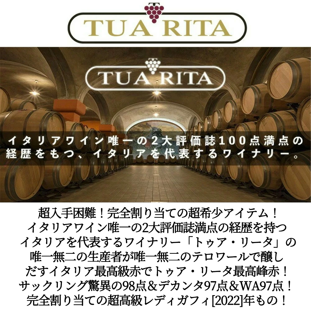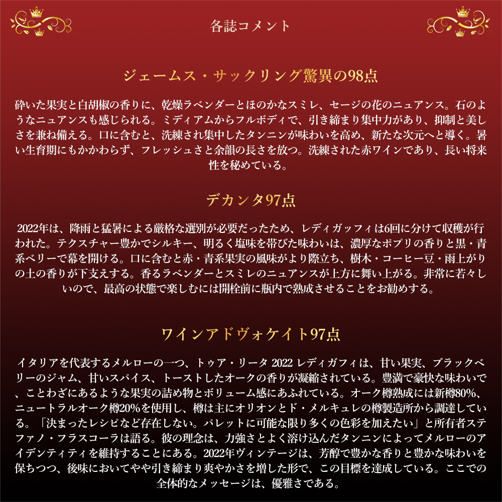 希少レディガフィのこの[2022]年でジェームス・サックリング驚異の98点でコメントは「砕いた果実と白胡椒の香りに、乾燥ラベンダーとほのかなスミレ、セージの花のニュアンス。石のようなニュアンスも感じられる。ミディアムからフルボディで、引き締まり集中力があり、抑制と美しさを兼ね備える。口に含むと、洗練され集中したタンニンが味わいを高め、新たな次元へと導く。暑い生育期にもかかわらず、フレッシュさと余韻の長さを放つ。洗練された赤ワインであり、長い将来性を秘めている。」!ワインアドヴォケイト97点!