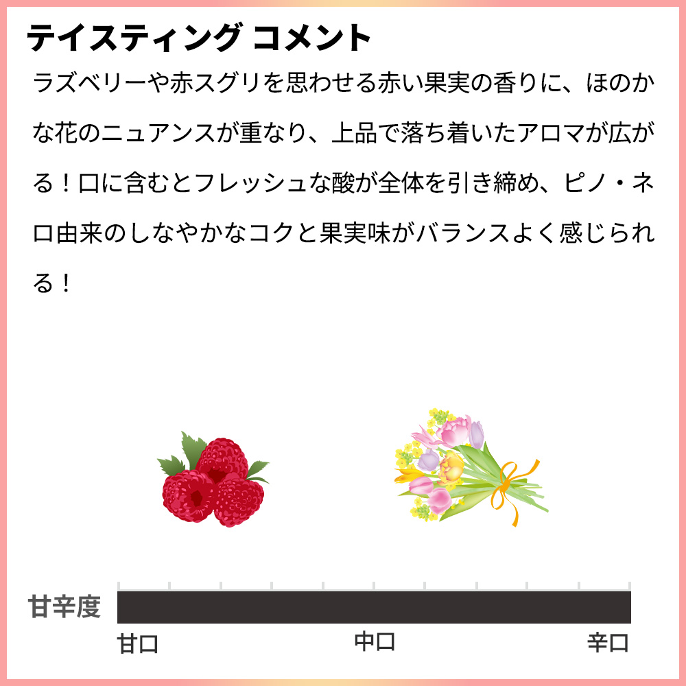 グラスに注ぐと、ラズベリーや赤スグリを思わせる赤い果実の香りに、ほのかな花のニュアンスが重なり、上品で落ち着いたアロマが広がる!口に含むとフレッシュな酸が全体を引き締め、ピノ・ネロ由来のしなやかなコクと果実味がバランスよく感じられる!