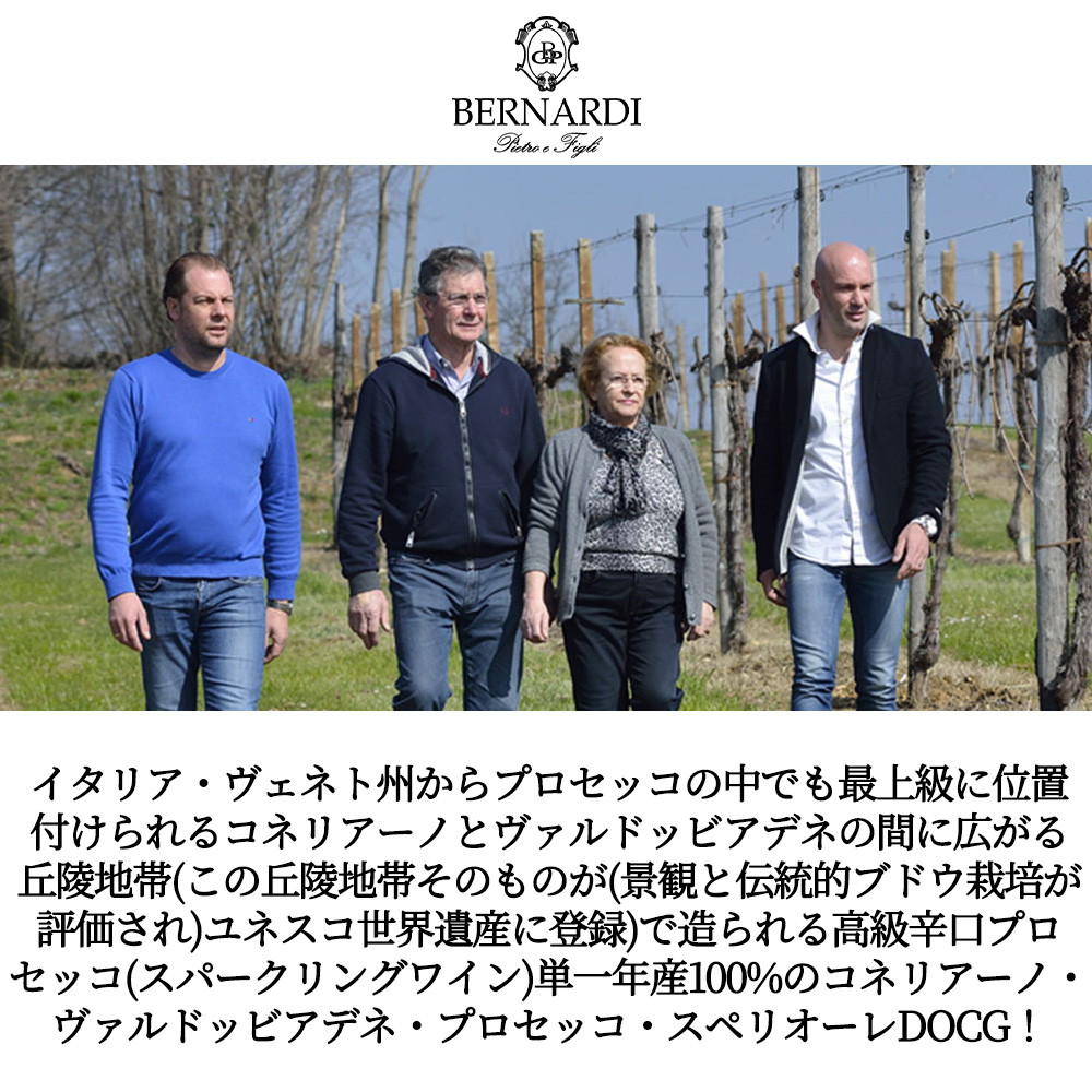 イタリア・ヴェネト州のコネリアーノとヴァルドッビアデネの間に広がる丘陵地帯で造られる高品質プロセッコで、2009年にDOCGへ昇格、2019年にはこの丘陵地帯そのものがユネスコ世界遺産に登録され、景観と伝統的ブドウ栽培が評価されているコネリアーノ・ヴァルドッビアデネ・プロセッコ・スペリオーレDOCG!しかも「カンパル」区画100%!(「カンパル」は区画名です。)