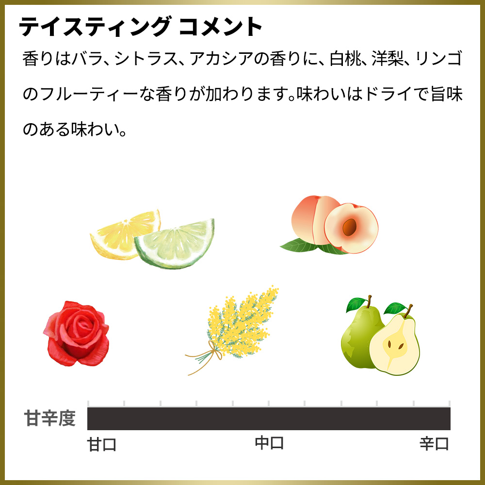 淡い麦わら色で、細かく持続するパール感があります。香りはバラ、シトラス、アカシアの香りに、白桃、洋梨、リンゴのフルーティーな香りが加わります。味わいはドライで旨味のある味わい。サーヴ温度は6-8度で。