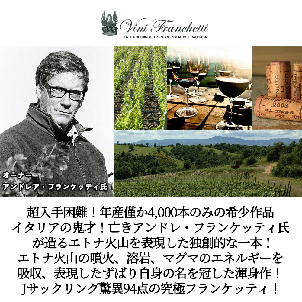 あのテヌータ・ディ・トリノーロを世に送り出したイタリア トスカーナの鬼才、アンドレア・フランケッティ氏が、トップクラスの名声を獲得しながらも、そのポテンシャルに惹かれ、未だ火山活動を続ける太陽溢れるシチリア!のエトナ火山の北斜面の、なんと標高1000mを越える場所 (火山灰と溶岩が風化したミネラルに富む) で、これまた通もうなづくボルドーの希少品種プティ・ヴェルド種70%にチェザネーゼ・ダッフィーレ種30%をなんと!ロマネ・コンティもまっ青の驚異の低収量で造り上げた奇才フランケッティ氏の超自信作!フレンチオークの新樽100% (225L) で6ヶ月+セメントタンクで12ヶ月熟成の、驚異の計18ヶ月熟成!