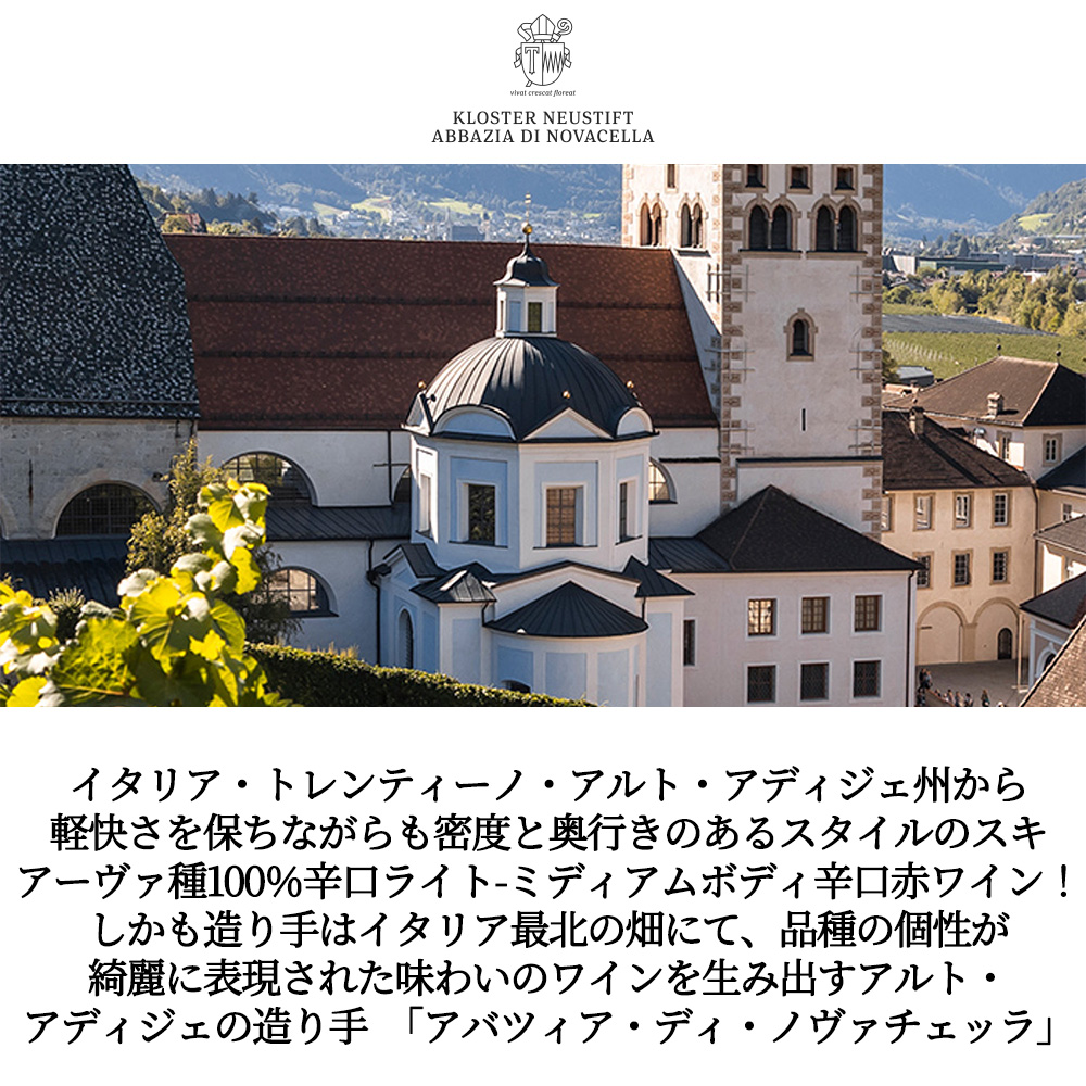 イタリア・トレンティーノ・アルト・アディジェ州から軽快さを保ちながらも密度と奥行きのあるスタイルのスキアーヴァ種100%辛口赤ワイン!造り手はイタリア最北の畑にて、品種の個性が綺麗に表現された味わいのワインを生み出すアルト・アディジェの造り手 「アバツィア・ディ・ノヴァチェッラ」!