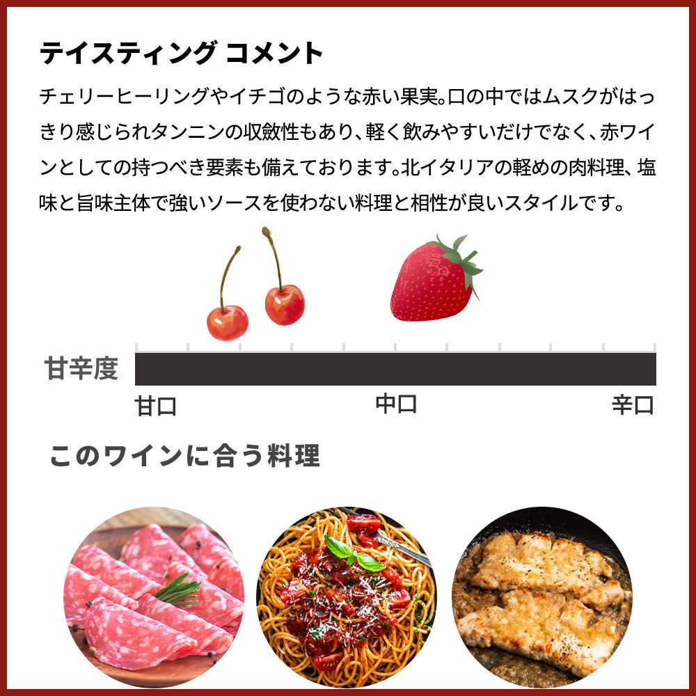 テイスティングコメントは非常に薄い可愛らしいルビー色。チェリーヒーリングやイチゴのような赤い果実。口の中ではムスクがはっきり感じられタンニンの収斂性もあり、軽く飲みやすいだけでなく、赤ワインとしての持つべき要素も備えております。北イタリアの軽めの肉料理(サラミ、スペック、ポーク、鶏肉料理)トマトベースの軽いパスタやピッツァ 和食では焼き鳥(タレより塩)、豚肩ロースのロースト、出汁系の優しい味付けの肉料理などなど、塩味と旨味主体で強いソースを使わない料理と相性が良いスタイルです。
