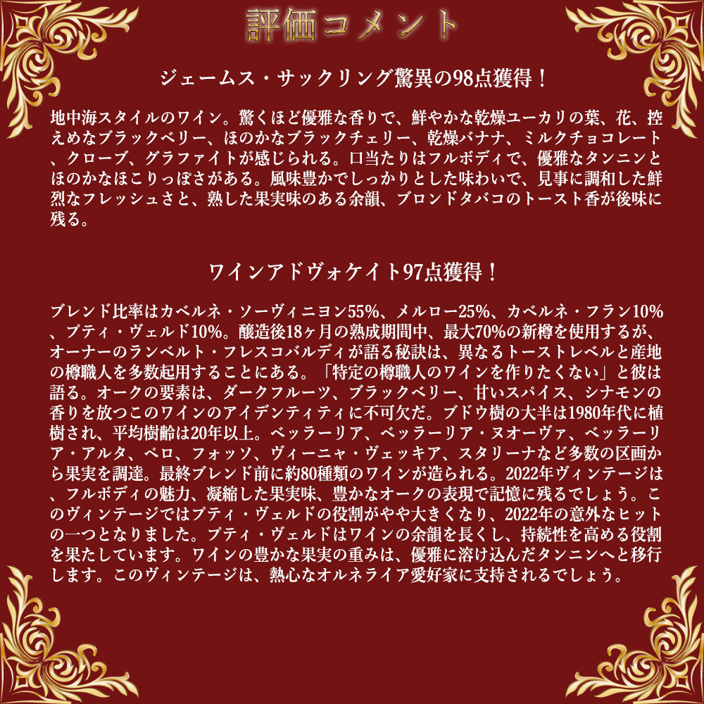 熟したフルーツの香りにハーブやチョコレートのニュアンス!味わいはボリューム感と甘くシルクのようなタンニンに生き生きとした酸!の究極フルボディ辛口赤ワインの最新ヴィンテージで高評価連発[2022]年がしかも正規代理店輸入品で限定少量入荷!