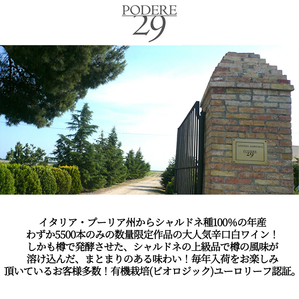 希少!イタリア・プーリア州からシャルドネ種100%の年産わずか5500本のみの数量限定作品の大人気辛口白ワイン!