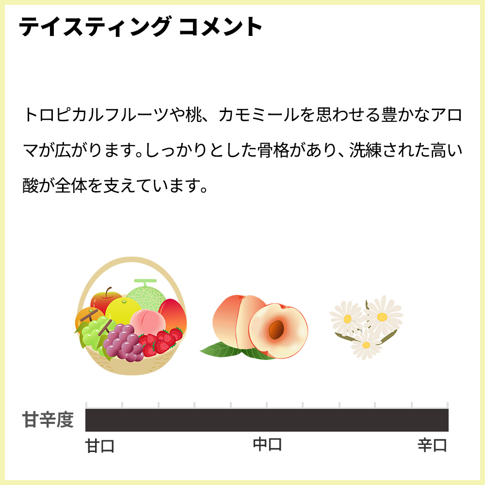 包み込むような柔らかさと驚くほどのコクがあります。トロピカルフルーツや桃、カモミールを思わせる豊かなアロマが広がります。しっかりとした骨格があり、洗練された高い酸が全体を支えています。エレガントで長い余韻があります。全生産本数わずか3200本のみです。もちろん正規品の素晴らしい状態で限定少量入荷!