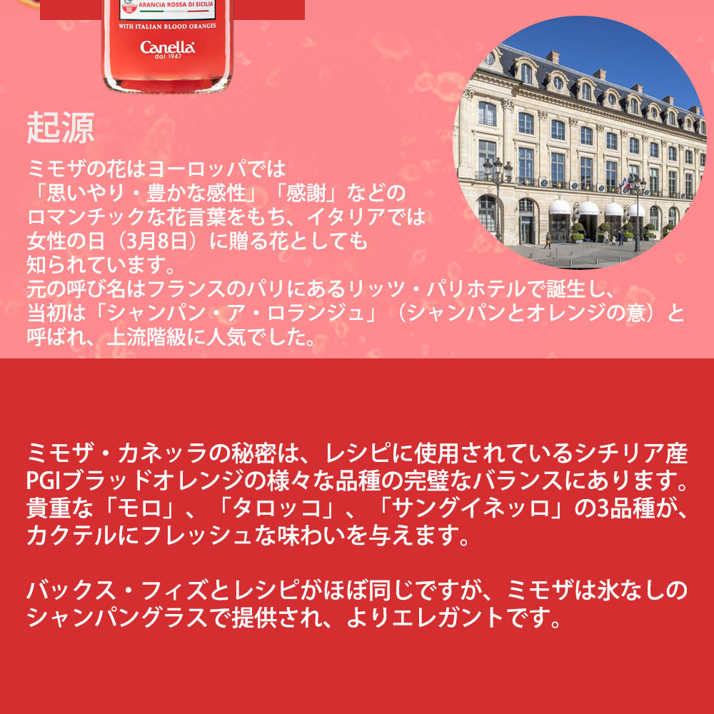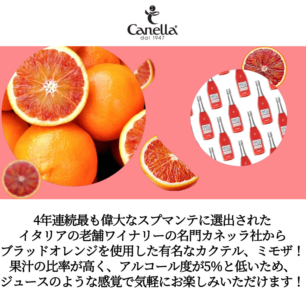 4年連続最も偉大なスプマンテに選出されたイタリアの老舗ワイナリーの名門カネッラ社からブラッドオレンジを使用した有名なカクテル、ミモザ!