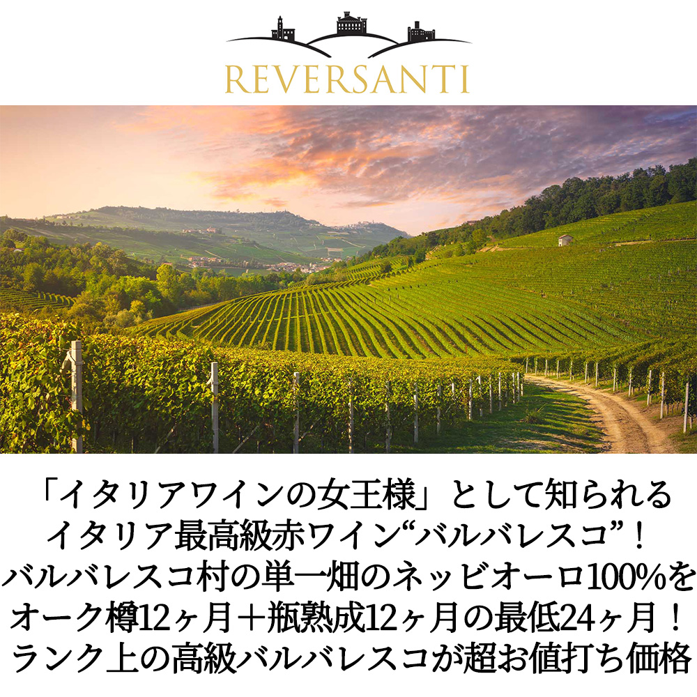 美しく輝くオレンジがかったガーネット色!ストロベリー、レッドカラント、ホワイトペッパー、シナモン、マッシュルーム、森の下草を想わせる複雑な香りが広がる!口当たりは柔らかく、芳醇な果実味に生き生きとした酸が溶け込む!きめ細かなタンニンとスパイスの風味が余韻に長く続く、エレガントな味わい!高級DOCG規格の偉大なバルバレスコの究極辛口フルボディ赤ワイン!