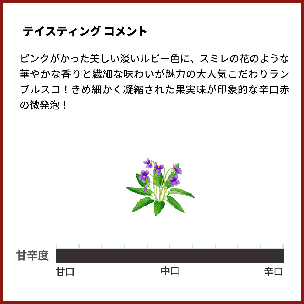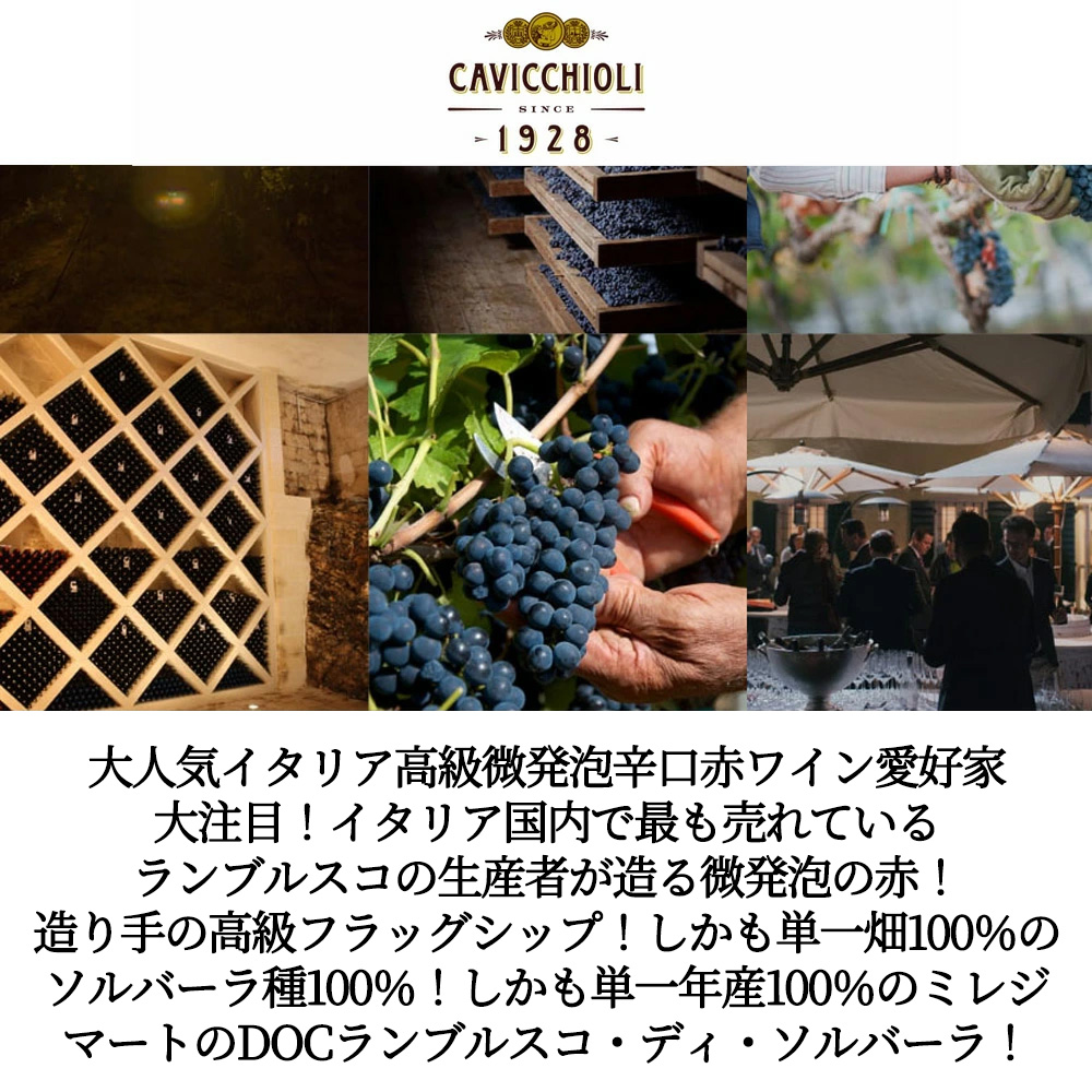軽やかな色合いながらも、凝縮した果実味豊かな上質のソルバーラ種を使用!美味しくてグルメなエミリア・ロマーニャ州のNo1ランブルスコ・カビッキオーリ!ピンクがかった美しい淡いルビー色に、スミレの花のような華やかな香りと繊細な味わいが魅力の大人気こだわりランブルスコ!