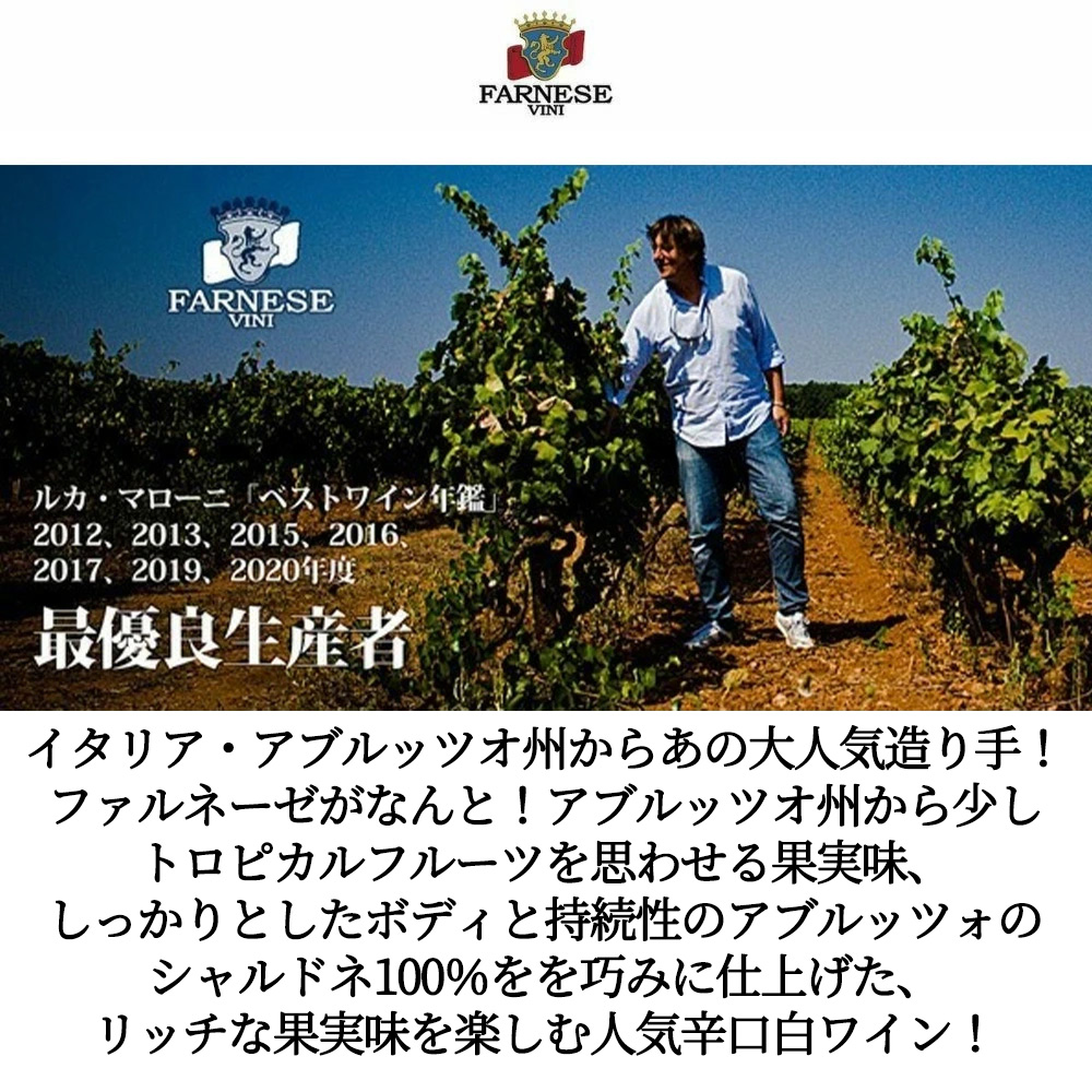 輝きのある麦わら色!少しトロピカルフルーツを思わせる果実味、しっかりとしたボディと持続性!ご家庭でも、レストラン様のボトル売りにもおすすめのファルネーゼの辛口シャルドネ100%辛口白ワイン!