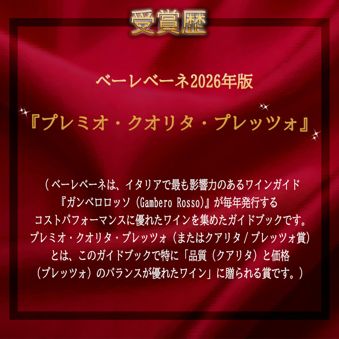 ベーレベーネ2026年版で『プレミオ・クオリタ・プレッツォ』 (プレミオ・クオリタ・プレッツォとは、このガイドブックで特に「品質(クアリタ)と価格(プレッツォ)のバランスが優れたワイン」に贈られる賞。) &『ワインエンスージアスト驚異の92点』獲得!