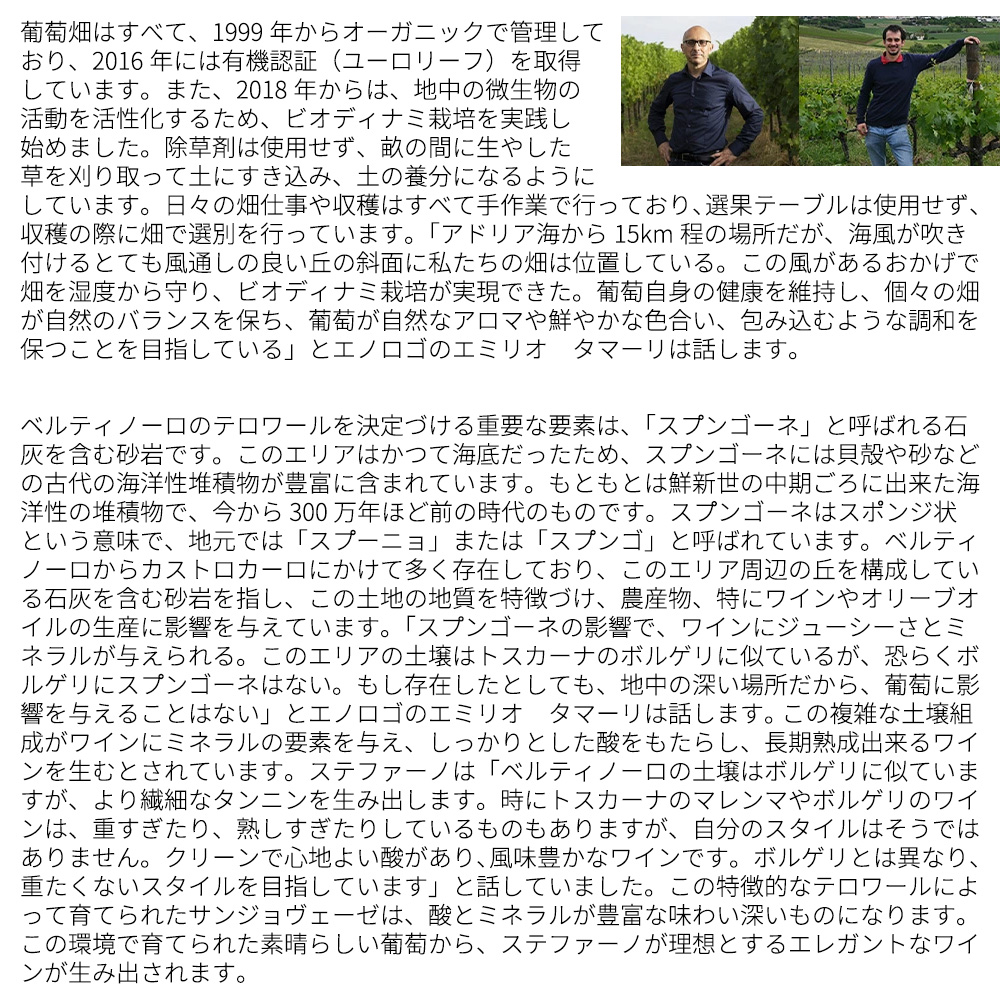 葡萄畑は、海を見下ろす、ベルティノーロの丘の斜面に広がっています!アドリア海とアペニン山脈に囲まれたこの場所は、特別なミクロクリマを持っています!土壌は粘土石灰岩質です!かつては古代の海底だった為、貝殻の化石や砂など海に由来する堆積物が多く存在しています!しかも設立当初より、化学肥料や殺虫剤を使用せず、オーガニックで栽培を徹底しています!