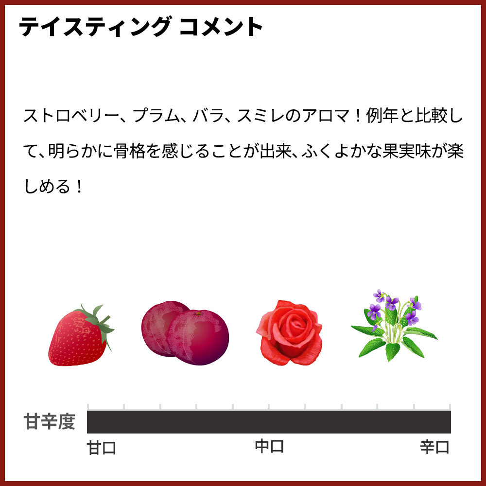 濃厚な赤紫!ストロベリー、プラム、バラ、スミレのアロマ!例年と比較して、明らかに骨格を感じることが出来、ふくよかな果実味が楽しめる!ミディアム~フルボディで現在、開いており、充分に楽しめる!バローロの素晴らしさを手軽に味わえる貴重な1本!